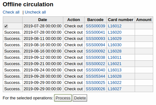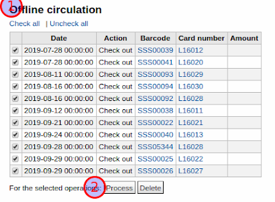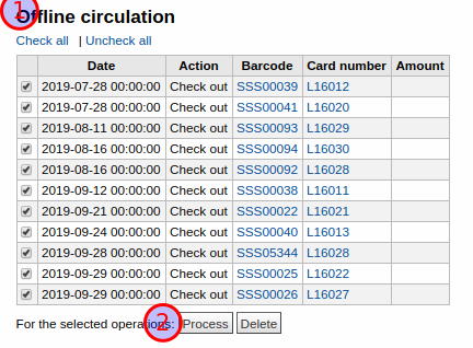 Goto Koha > Circulation > Offline circulation > Pending offline circulation actions Select all the entries and click the Process button.