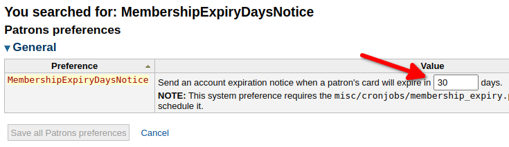 2. Visit each patron category at Administration > Patron categories and change the configuration, Overdue notice required (Yes).
