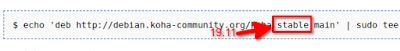Koha releases a new version every six months (May and November). The current version is called stable and previous version is called oldstable. The code names stable or oldstable should be mention in the Koha Debian software repository line at the time of installation. For example,