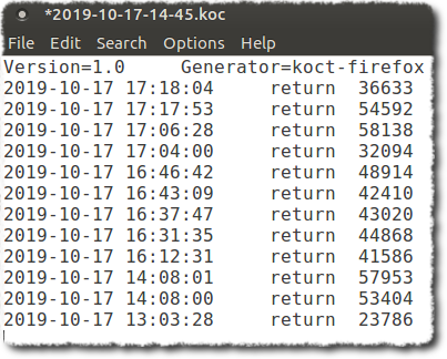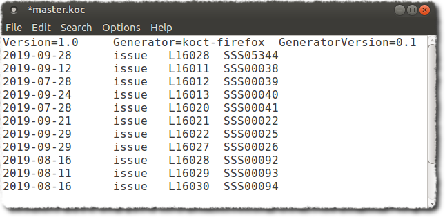 koc stands for (Koha Offline Circulation.Download a sample .koc file from here. Open the .koc file using a text editor (e.g. leafpad. mousepad). Copy the entire checkout entries from csv (except column names) to .koc file.