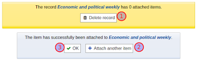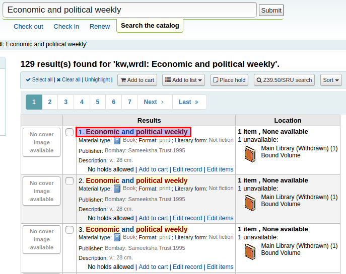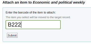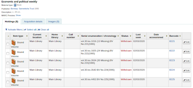 For example, bound volumes of Economic and Political Weekly catalogued as separate records with items. The search result shows many records of the journal bound volumes. If we merge all the records into one, users can find the entire journal bound volumes details by opening a single record.