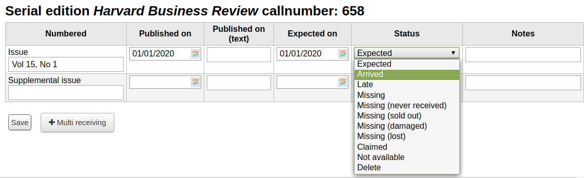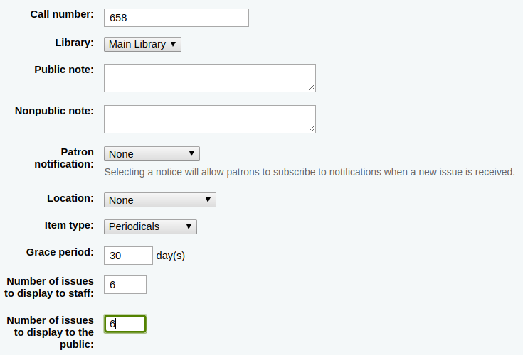 Call number: Item’s call number of the journal. Library: The branch subscribed the journal. Public note: Information for the OPAC for the patrons (e.g. Discontinuation of a particular volume) Nonpublic note: Notes that are only visible to the librarians via the staff client (e.g. Demand Draft details). Patron notification: Notice sends to patrons on arrival of new issues (Routing list). Location: Shelving location of the journal. Grace period: The number of days before an issue automatically move from ‘Expected’ status to ‘Late’. The Staff and OPAC display options allow you to control how many issues appear by default on bibliographic records in the Staff Client and the OPAC.