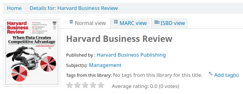 Note:Adding a representative journal jacket to catalogue record will be more attractive and users can easily recognise the journal while searching from OPAC. Journal cover picture can be collected from the publisher website. The journal cover can be upload from Biblio details in the staff client.