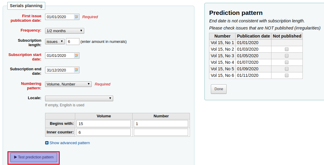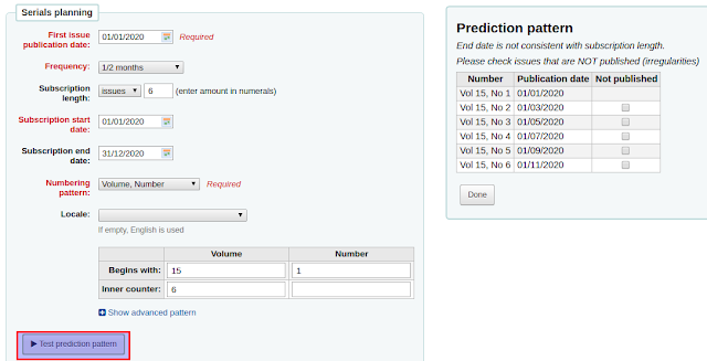 First issue publication date: First issue of the journal after the subscription starts. Frequency: Various frequency of the journal (e.g. Weekly, monthly, quarterly etc.) Subscription length: The number of issues or months in the subscription. Subscription start date: The date at which the subscription begins. Subscription end date: End date of the current subscription. Numbering pattern: The numbering pattern follows in the journal (e.g. Volume, Issue). Locale: To display days, months, the season in regional language (e.g. Persian). Click on Test prediction pattern to get an idea of the issue numbering of the journal. Save the subscription.