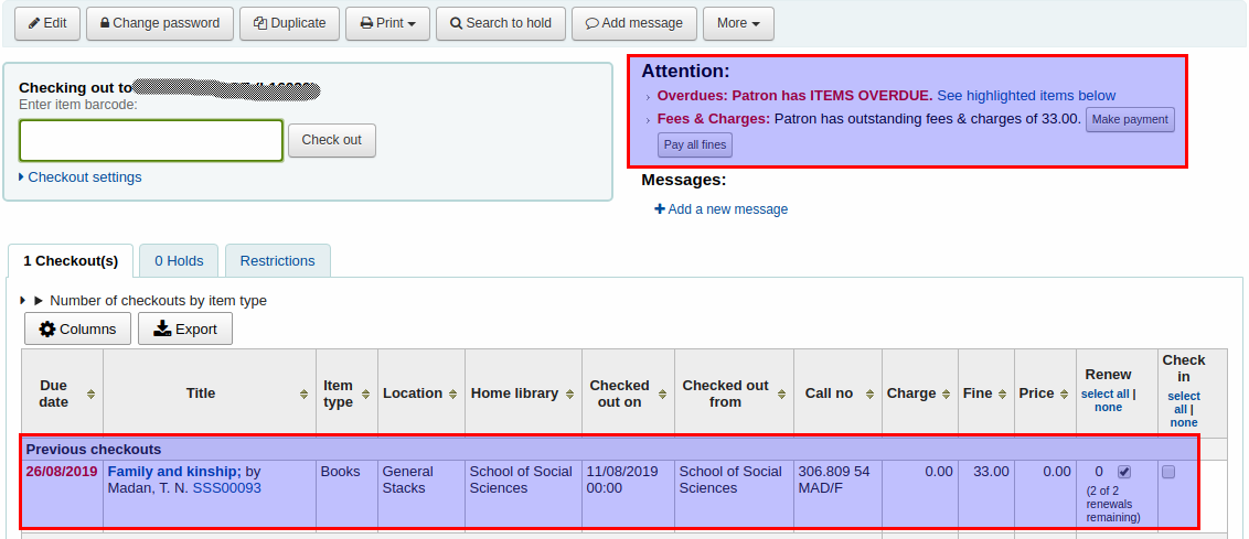 3. Open the Patron account to generate Discharge. Find the Discharge button at the end of the Patron account.