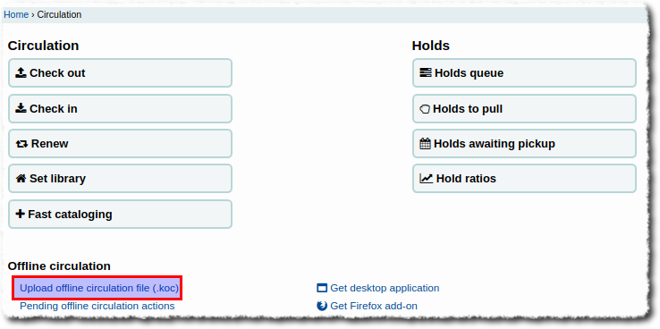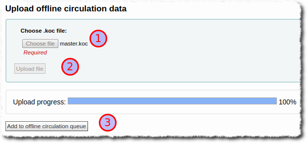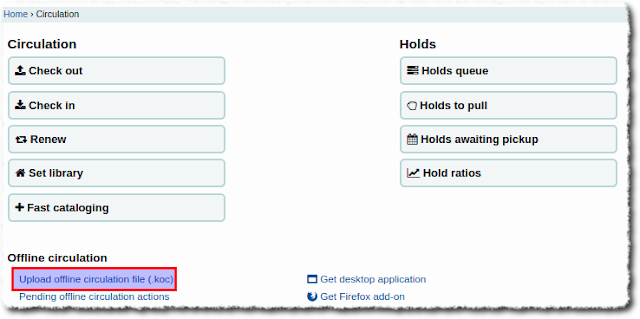 Goto Koha > Circulation > Offline circulation > Upload offline circulation file (.koc) Find and upload the .koc file. Don't worry, if the screen show time out.