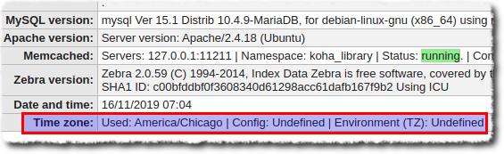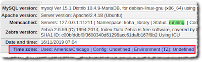 1. First, check the default timezone with Koha, check at Koha > About Koha